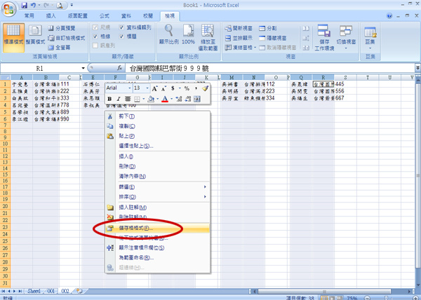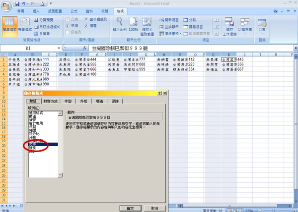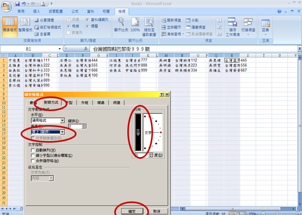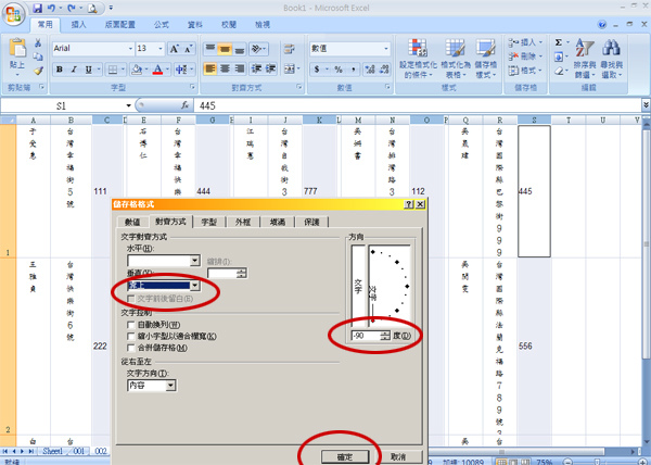 4.選取"郵遞區號" >儲存格格式 >文字 >對齊方式 文字方向改成-90