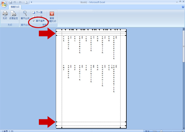 6.預覽列印 >勾選"顯示邊界" 將上下列印範圍拉大至可以容納3列 即可。
