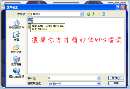 就找出你剛剛轉好的mpg檔案,然後開啟